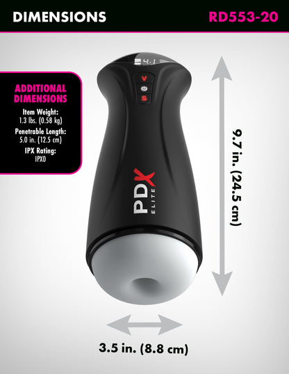 The PDX ELITE Fap-Gasm elevates masturbation with powerful intermittent suction and vibration for the ultimate stroker experience. It's a perfect storm of sensation for heightened solo sex sessions that can be customized to your personal moods! Get ready for explosive hands-free pleasure as the Intermittent Suction Technology automatically sucks your penis in and out. Designed for ultimate pleasure, the textured walls of the ultra-soft sleeve is like nothing you've ever felt before! The Fap-Gasm is ready when you are, and will deliver the most intense orgasms you've ever had!